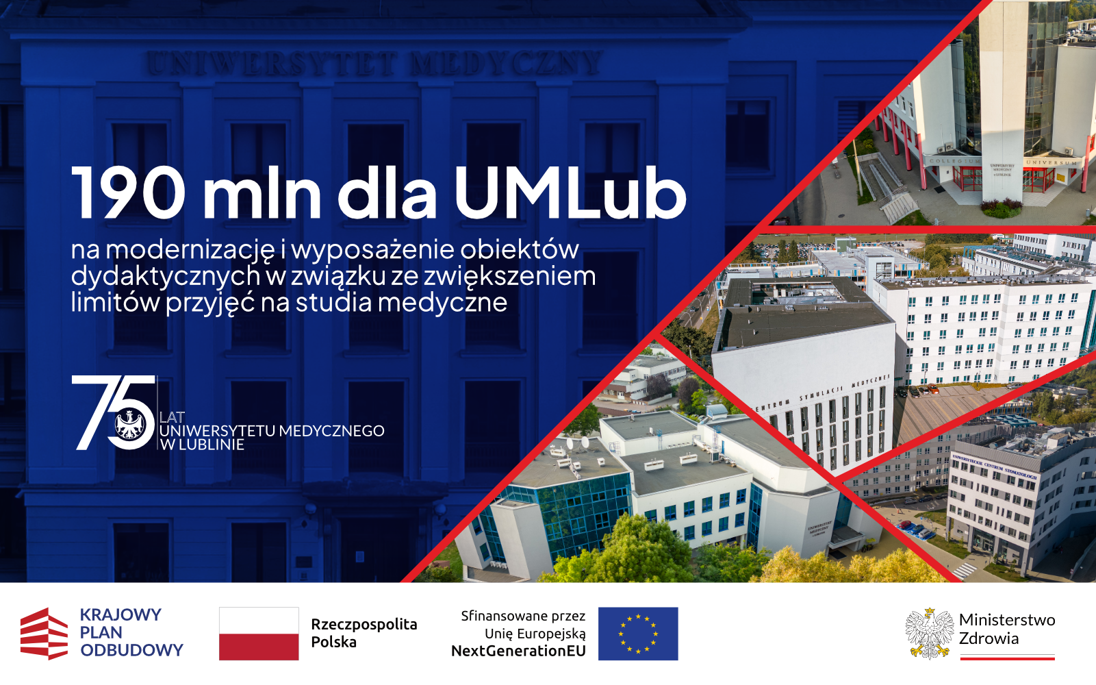 Informujemy społeczność #UMLub o podpisaniu przez Ministerstwo Zdrowia umowy o finansowanie projektu pn. „Modernizacja i wyposażenie obiektów dydaktycznych w związku ze zwiększeniem limitów przyjęć na studia medyczne – Uniwersytet Medyczny w Lublinie”, złożonego w ramach Krajowego Programu Odbudowy, D2.1.1 „ Inwestycje związane z modernizacją i doposażeniem obiektów dydaktycznych w związku ze zwiększeniem limitów przyjęć na studia medyczne”.